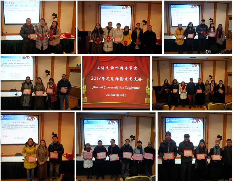 大会的颁奖表彰环节,澳门正规电子游戏平台继续秉承传统,对教师在教学、科研、党务、宣传报道、工会活动等各方面表现优秀的集体和个人进行奖励。本年度澳门正规设立了六个优秀集体奖:示范性课程团队、全英文课程团队、外语学科竞赛指导小组、学科建设团队、同传实验室建设团队、招生团队;八个单项奖:优秀教学奖、科研贡献奖、青年科研贡献奖、优秀外教、优秀党务工作者、宣传报道贡献奖、工会活动积极分子及综合贡献奖。学院领导为获奖者撰写颁奖词并颁发荣誉证书,这不仅是对获奖老师所做工作的肯定,也是对全院老师今后更加努力工作的激励。