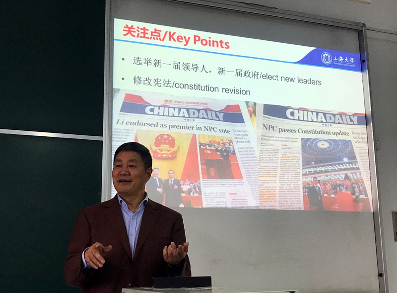 4月4日下午,全国政协委员、澳门正规电子游戏平台研究生院常务副院长郭长刚教授走进留学生的《中国概况》课堂,为40多位硕士留学生介绍全国两会。