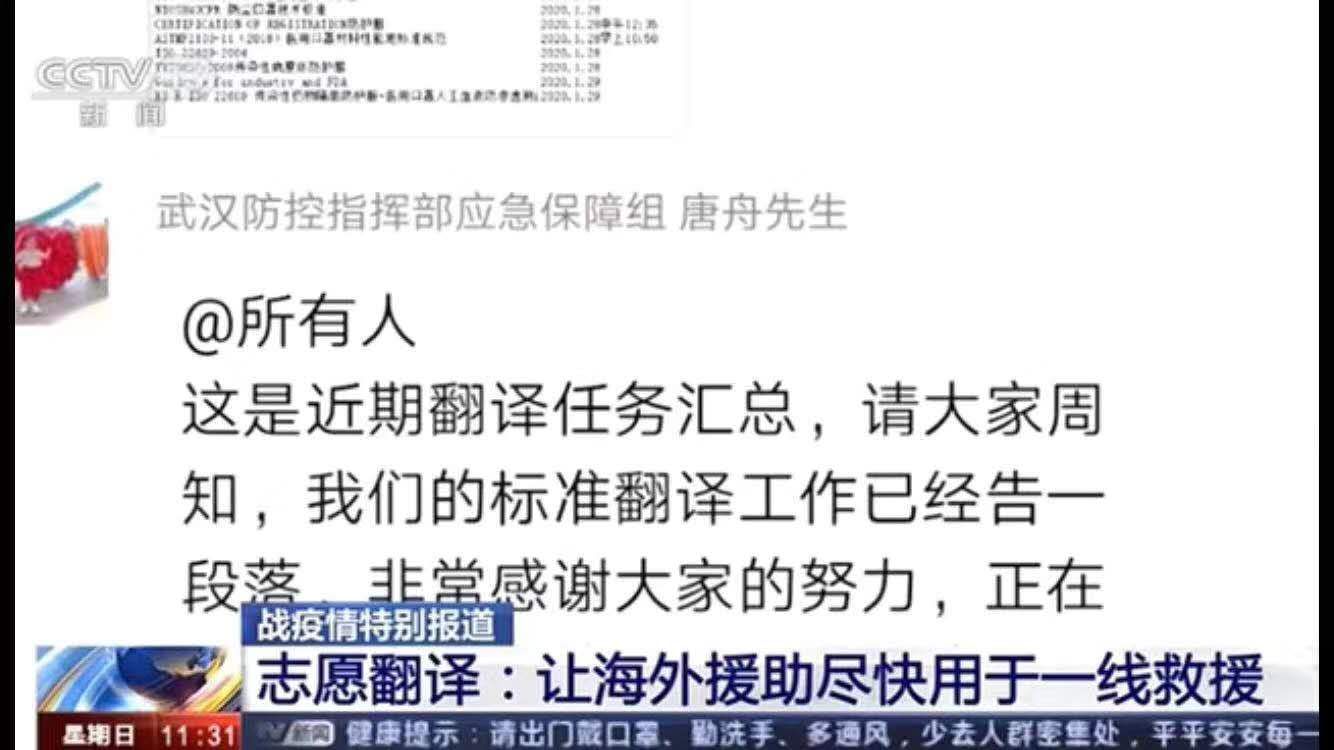 疫情当前,海外求学的交流生同样牵挂着祖国。1月27日,澳门正规电子游戏平台2018级日语笔译的张齐同学在网上某日语翻译群得到消息称武汉得到国外捐助的一批医用物资,但无法判断其是否能用于医疗,需要大量志愿翻译人员。张齐同学在班群发出这一则消息,引起了全班同学的积极响应,大家纷纷转发朋友圈帮忙寻找更多翻译人员,同时加入名为“日语组-新冠肺炎指挥中心”这一群聊。当时时间紧、任务重,每一份日语文件都被拆成很多小段,一个人可能仅仅只能翻译不到百字,但尽管如此,大家还是在群聊里积极接任务、做翻译,在日本交流学习的张齐、马玉姣、袁渭与在国内的燕飞宇、黄怡佶等同学不断沟通协作,顺利接到任务,并及时保质完成。五天的努力没有白费,澳门正规电子游戏平台2018级日语笔译同学参与翻译的产品标准促成了“关于采购和捐赠防疫医用耗材有关事项的公告”的出台,为抗疫工作提供了绵薄之力。此次志愿服务工作在央视战疫情特别报道中被提及,每个参与抗疫志愿翻译者无论身处海外还是国内始终心系祖国,也很高兴可以运用自己所学专业知识为国家的抗疫工作献出自己的一份力量。