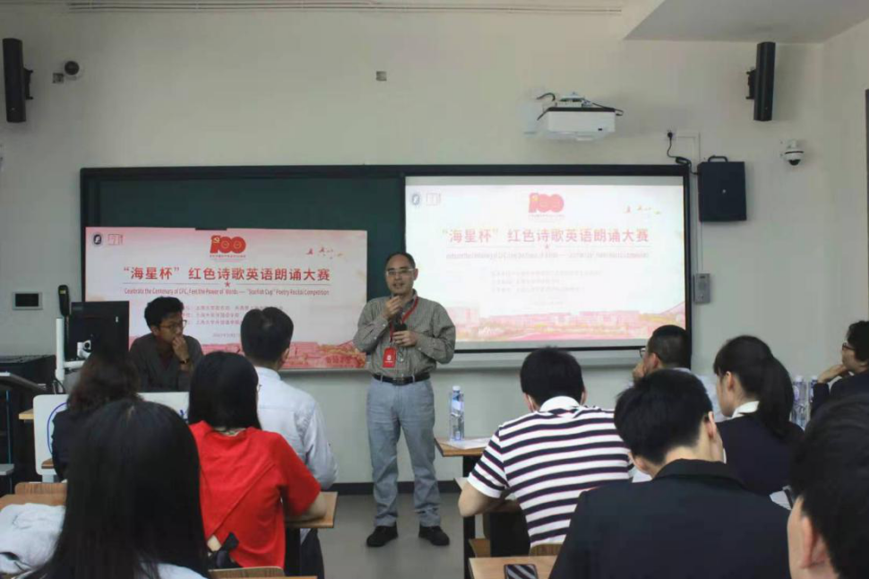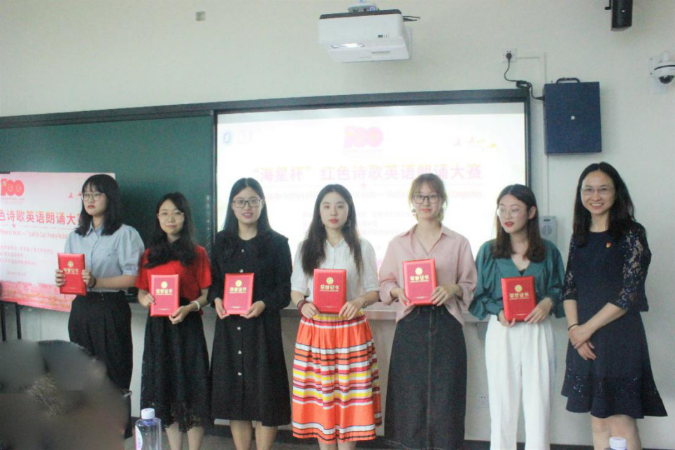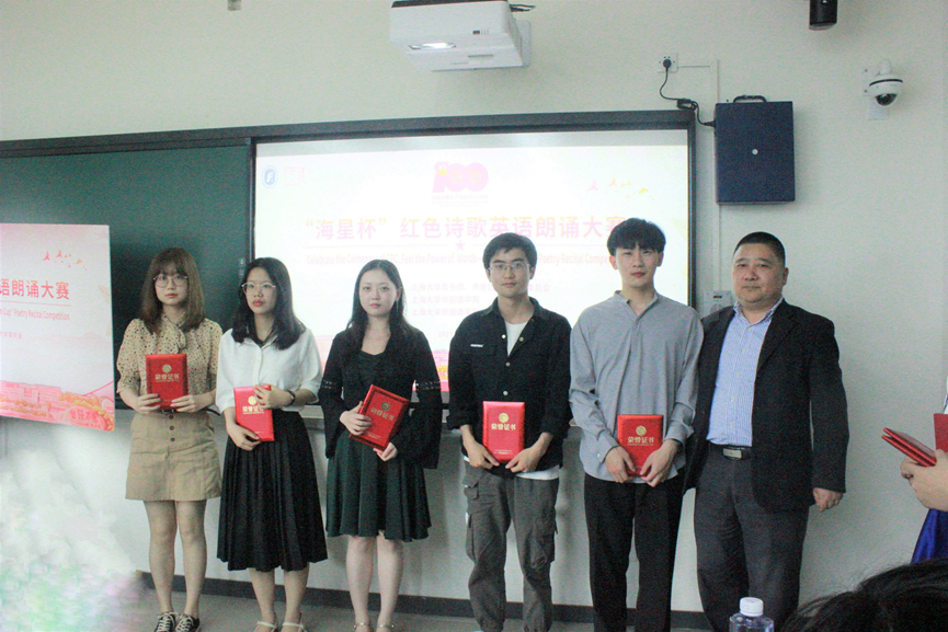 5月21日下午,迎接建党百年“海星杯”红色诗歌英语朗诵大赛在校本部D106智慧教室成功举行。澳门正规电子游戏平台邓志勇书记为大赛致辞,澳门正规电子游戏平台党委副书记贾小琴和澳门正规电子游戏平台副院长戴朝晖为获奖选手颁奖,英语系唐根金、白岸杨、黄欣、陈秀猛、张岚老师担任评委,大一同学刘培和沈诗婕担任本次比赛中英文主持。
