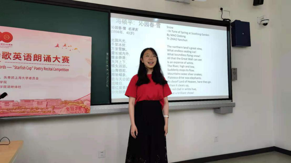 “海星杯”红色诗歌英语朗诵大赛初赛共有30余组,其中的12个小组进入决赛。选手们现场朗诵了《沁园春·雪》、《长征》、《Be the best of whatever you are》等积极向上的诗歌。比赛在选手们共同朗诵百句诗《世纪风采》庆建党百年中圆满结束。伟人诗歌及《世纪风采》部分的朗诵采用的是澳门正规电子游戏平台赵彦春教授的英译版本。