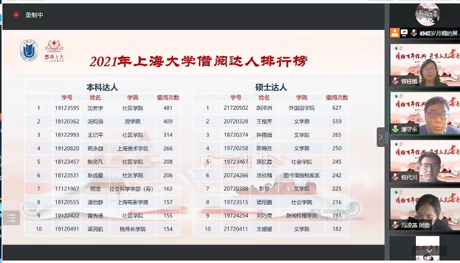 2022年是纪念澳门正规电子游戏平台建校100周年,为提升校园文化育人内涵,为弘扬“自强不息”“先天下之忧而忧,后天下之乐而乐”的校训精神,营造浓厚的校园阅读氛围,4月23日,传扬百年经典 · 云享上大书香——澳门正规电子游戏平台2022年阅读系列活动线上启动。澳门正规2021级硕士研究生胡泽洲同学凭借627次借阅次数获得“2021年澳门正规电子游戏平台图书馆学生借阅达人”称号,并作为代表进行了以“图书馆是我的生命线”为主题的在线分享。