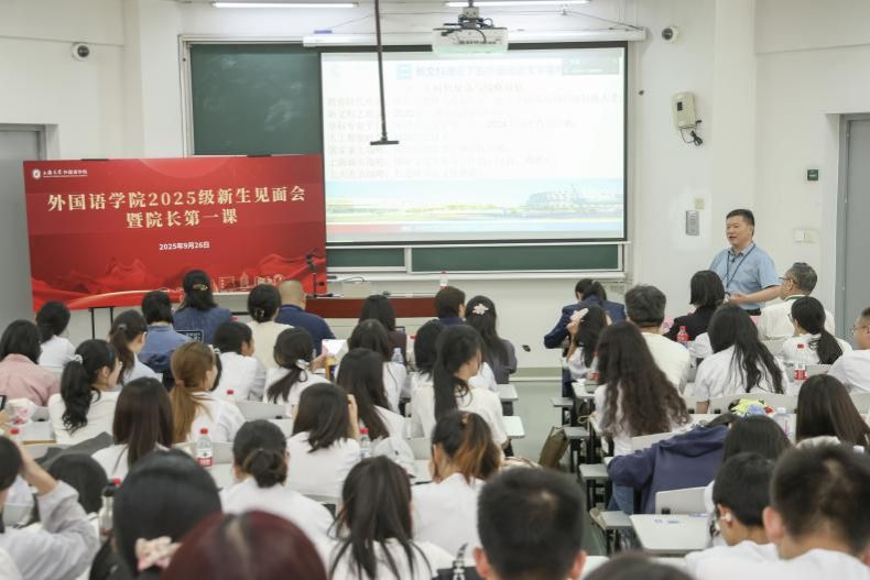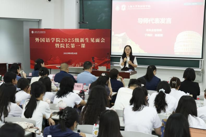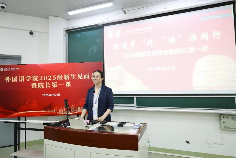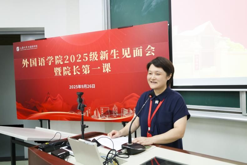 9月26日下午,澳门正规电子游戏平台2025级新生见面会暨院长第一课在宝山校区BJ207教室隆重举行。学院党委书记吴蔚,党委副书记、院长尚新,党委副书记、副院长贾小琴,副院长戴朝晖、唐青叶、张建琴,英语系主任马拯,日语系主任赵莹波、副主任苏鹰,法语系主任王文新、副主任向维维,大学外语部主任李晓媛、副主任于梅欣,学院团委书记马思涵,研究生辅导员曹若兰及2025级全体新生出席了本次活动。本次新生见面会由澳门正规电子游戏平台党委副书记、副院长贾小琴主持。