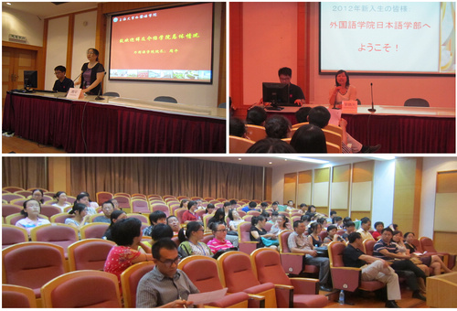 下午学院在J201举办了迎新会暨新生家长会活动。院长周平致辞并介绍学院情况,语重心长地鼓励新生们学会独立学习和生活。副院长庄恩平介绍了学校通识教育概况和学院人才培养的特色,引导大家在学好专业的同学多方面发展自己。日语系副主任李晓光用轻松活泼的方式全面地重点介绍了日语系的师资力量、学生培养、社团活动、海外交流及实习与就业等一系列学生和家长关心的问题,激发同学们学习日语的热情。党委副书记王国建在介绍了学院学生工作后,寄予学生们以厚望并给予了同学们最温暖的学习和生活建议。