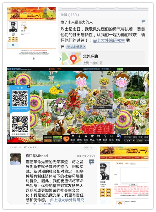 响应校团委的号召,外语学院研究生于9月30日开展了"国庆勿忘祭先烈,网上祭扫表真情"烈士纪念日主题活动,以实际行动追悼革命烈士,寄托革命哀思。外语学院研究生团总支在研究生群体中积极宣传动员,获得了热烈的响应,开展了包括主题微博留言、主题微博转发和在祭扫网站为革命先烈献花留言等丰富多彩的教育活动。