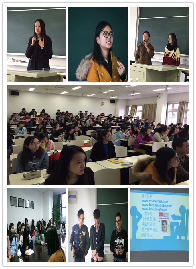 为了进一步加强班级内部的联系,建设良好班风,建立更好班级学习氛围,13级英语专业和日语专业共5个班级在秋季学期就积极申请了学校的"卓越班级",在冬季学期开始之际,全体同学开展了促进学风建设的主题班会活动。各班主题班会分为三大块,一是班委对班级秋季学期工作的总结,二是详细讲解卓越班级建设事宜,三是按照自己的兴趣和希望提高的方面进行分组。