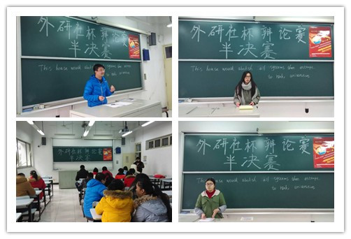 半决赛赛制依旧采用英国议会制(British Parliament)的形式,辩题围绕"是否要废除给大学分等级"这一问题展开。比赛在两个赛场同时进行,就这一问题,由循环赛晋级半决赛的八支队伍都阐述了自己的观点,正方从不同学校教育水平和实力的不同、以及分级制度在激励学生等方面阐述了支持大学分级制度的观点,反方则从学生在分级制度中所受的压力以及在就业中所受的歧视等方面支持自己的观点,给观众献上了精彩的演讲,现场氛围热烈。辩手们用自己雄辩的口才以及良好的台风赢得了现场观众的一致赞同和肯定,最后雷远旻老师和韩静老师就选手表达的流利程度、论据的阐述、临场发挥以及台风等方面给予了专业的点评和指导意见。