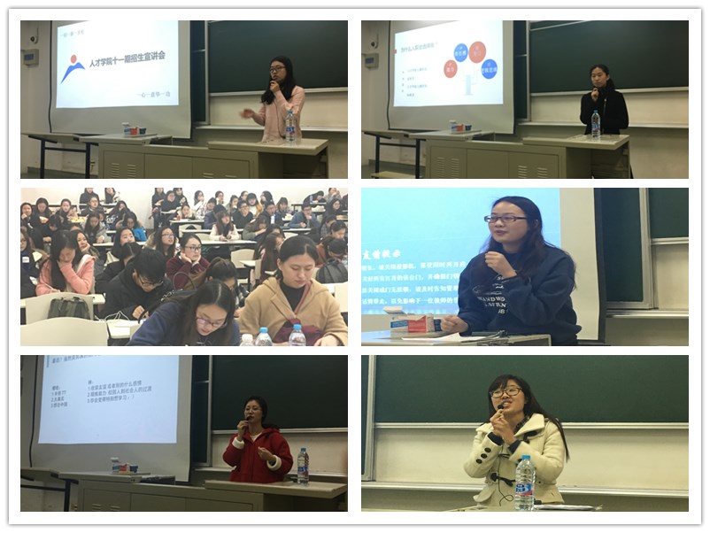 作为上大人才聚集之处,人才学院吸引着各个学院优秀学子的关注。人才学院汇聚校内外优质资源,全力打造未来社会精英人才。在本次首日教育中,人才学院的同学们带来了"让优秀成为习惯:关于人才锻造的上大故事"的精彩分享。2015级本科生王歌同学为人才学院第十期学员,她从"我们是谁?"、"为什么选择人院?"、"为什么人院选择我?"以及"为什么人院选择你?"四个版块引入,分别讲述人院学员的构成、人院学员的初衷、人院学员的骄傲和人院对新学员的要求。其中在"为什么选择人院?"环节中,人才学院九期学员沈玠含同学分享了自己起初对人院的期待,在期待中不断完善自己,向身边优秀的人学习,不断收获成长。她说,自己很幸运,感谢人院提供的各种平台和锻炼机会。在谈到"为什么人院选择我?"时,人才学院九期学员孙奕灵同学回顾了自己通过努力所取得的优异成绩。她表示,人院的肯定对她自己是继续前进的动力,只要不断地学习和努力,一定可以遇见更好的自己。