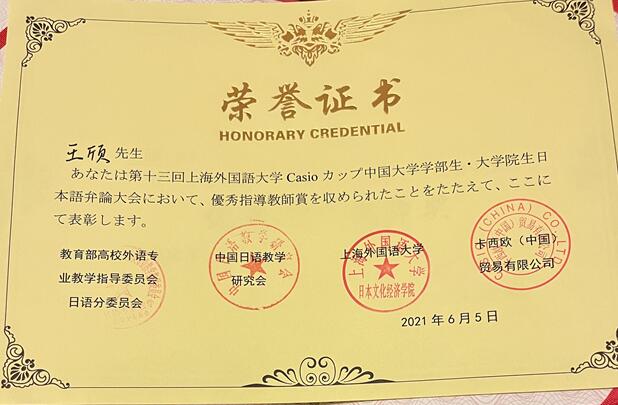 日语专业的王颀老师在指导学生参加学科竞赛方面,同样成绩斐然。仅在2021年,王老师指导的学生中就有三名同学获得国家级大奖。6月,日语系朱雅兰同学在王颀老师的指导下,在“卡西欧杯”日语专业研究生本科生辩论大赛中,同来自全国各地高校、共21名日语专业本科生及研究生相互角逐,凭借扎实的语言功底、出色的临场发挥,喜获二等奖。作为一名大四的本科生,惜败于上海外国语大学的博士研究生,屈居第二,是非常不容易的。这离不开朱同学的顽强拼搏,也得益于王老师专业细致的指导。