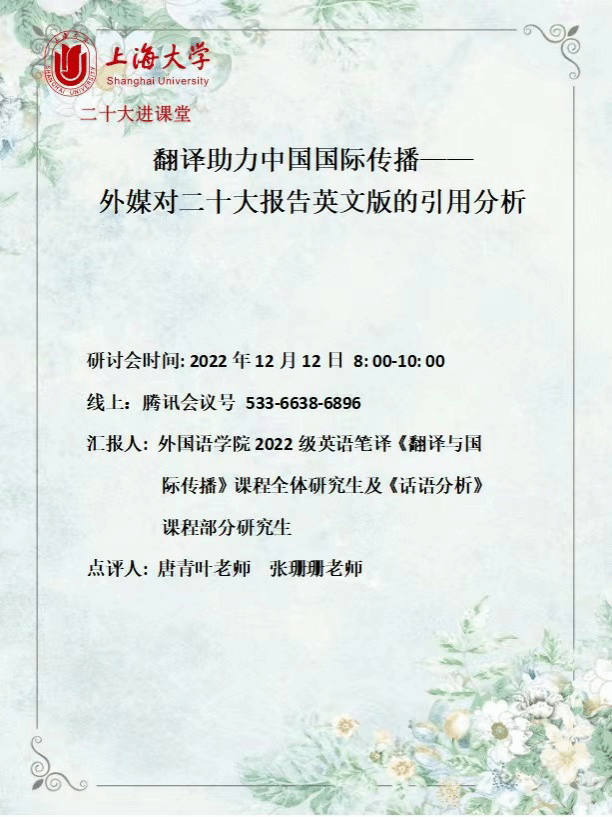 12月12日上午,澳门正规电子游戏平台于线上腾讯会议举办“翻译助力中国国际传播——外媒对二十大报告英文版的引用分析”研讨会。本次分享是澳门正规电子游戏平台翻译硕士专业(MTI)22级研究生课程《翻译与国际传播》中“中国政治话语翻译与国际传播”专题研讨,由唐青叶教授主持,80余名研究生和老师参加。