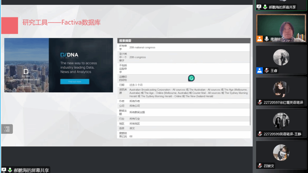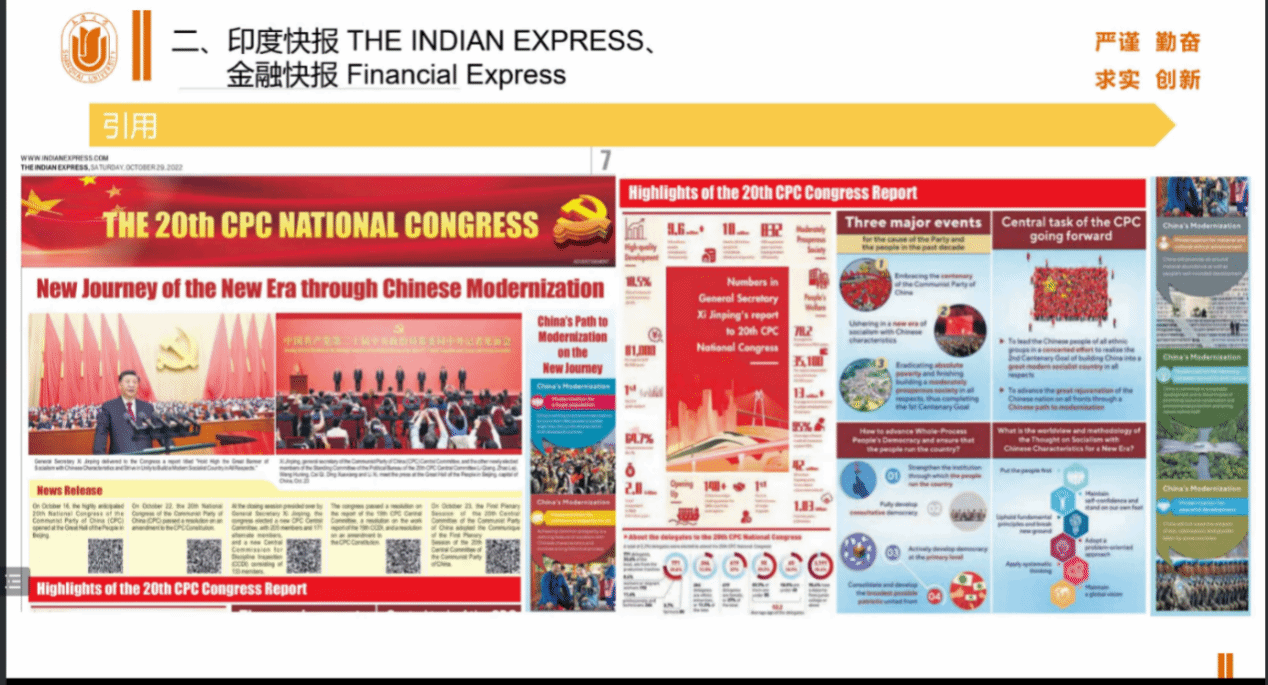 在老师们的指导下,67名同学组成14个小组,借助Factiva数据库和语料库工具,重点考察了中亚、中东、东亚、东南亚、南亚、非洲、欧洲、北美、拉美和澳洲10个区域30余个国家的主流媒体在二十大开幕会和闭幕会之后一个星期的报道情况。